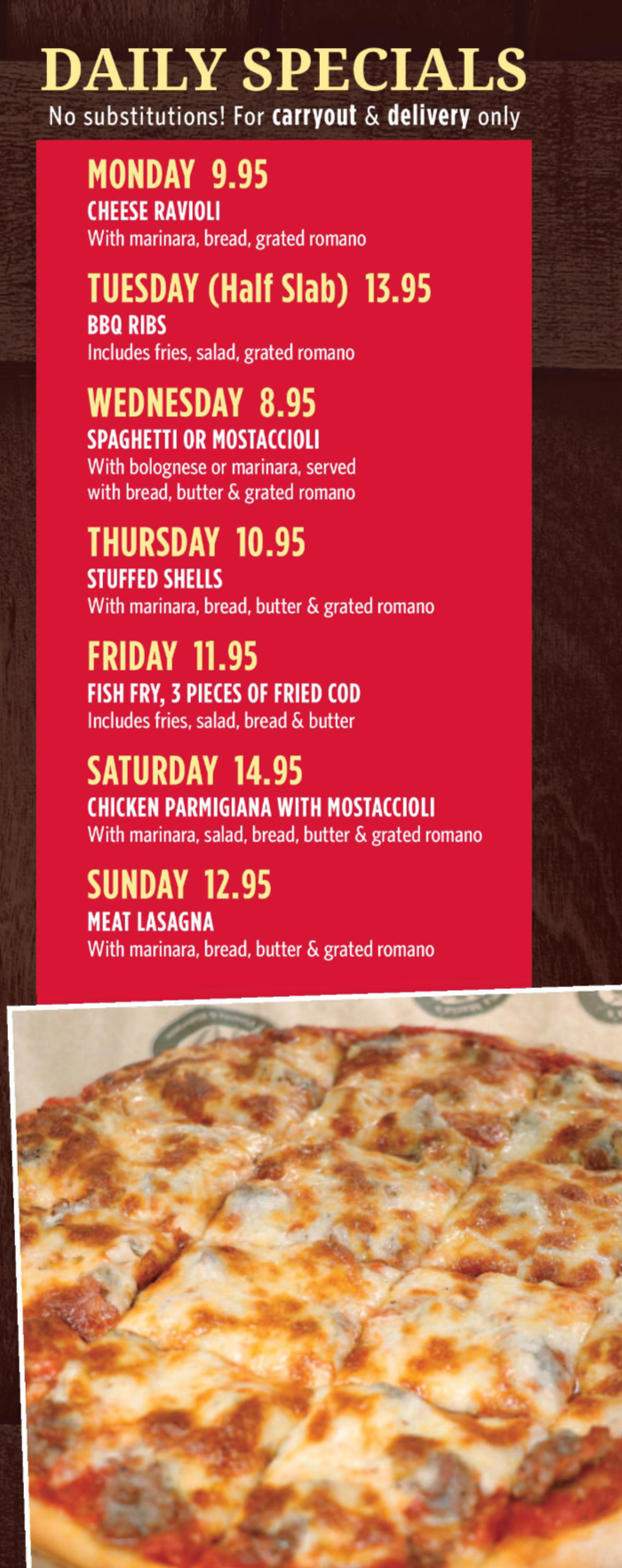 daily specials by DiMaria4380 | Mar 2, 2025 | 0 comments Submit a Comment Cancel replyYour email address will not be published. Required fields are marked *Comment * Name * Email * Website Save my name, email, and website in this browser for the next time I comment. Δ